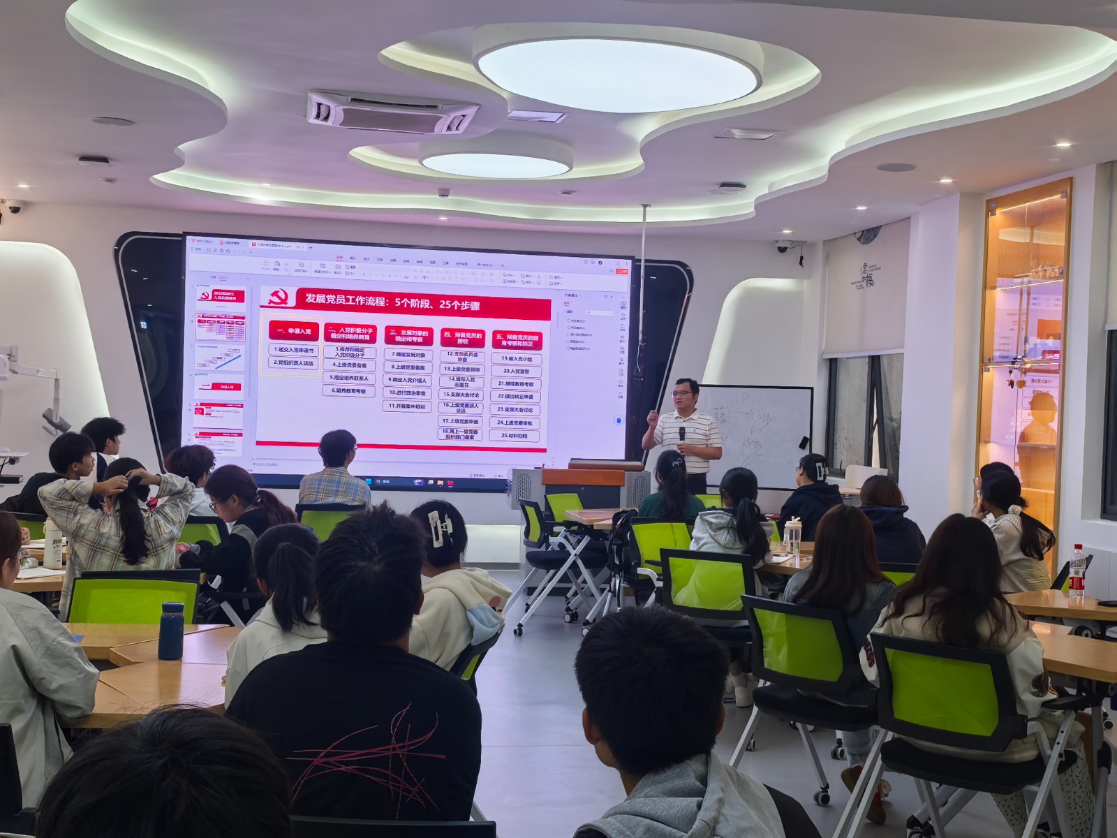 11月14日,支部组织委员许灿钰同志在“一站式”社区党团活动室开展“入党流程宣讲会”,现场拆解发展党员的5个阶段、25个关键节点进行细致讲解。现场设置答疑环节,针对新生普遍关心的问题逐一回应,帮助大家清晰掌握入党全流程,确保“路径明、方向清、步子稳”。